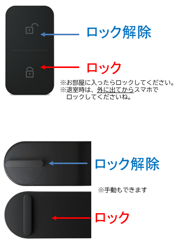 中に入ったら、ロックしてください。ロックはスマホ操作の他、部屋の内側のドアボタン(ドア横、ドア下)でも操作できます。